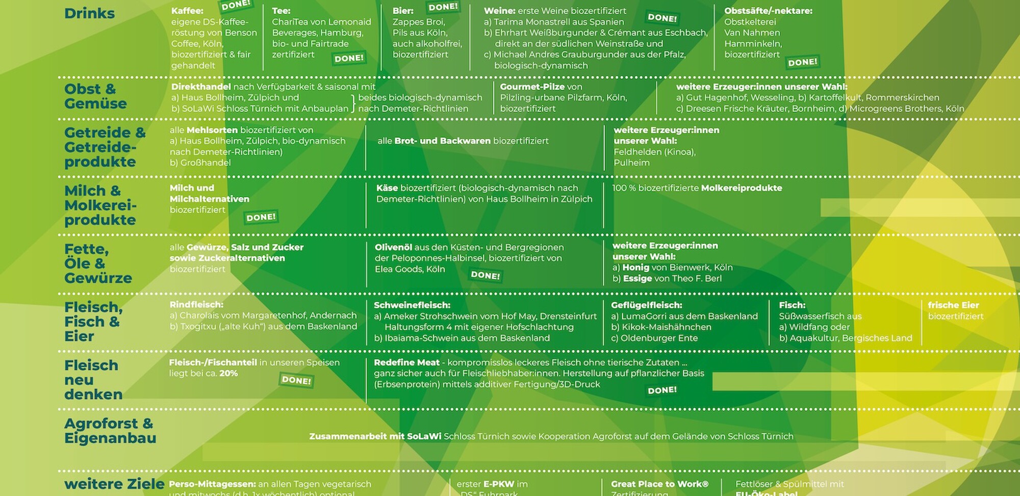 Wir sind seit August 2021 biozertifiziert. Das bedeutet im Einzelnen: Auf Wunsch könnt ihr bei uns euer komplettes Speisenangebot für euer Event in Bioqualität ordern. Standardmäßig gibt es bei uns ChariTea Bio-Tees sowie Biomilch und jegliche Milchersatzsorten in Bioqualität. Weiterhin haben wir ausgesuchte alkoholfreie und alkoholische Getränke im Sortiment. Kontrollstelle: DE-ÖKO-006
