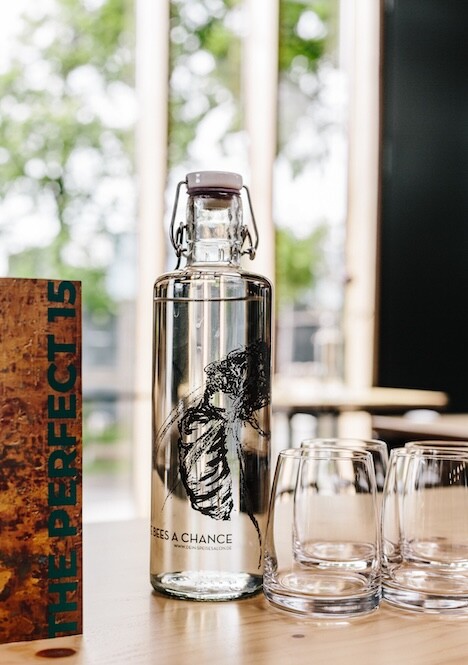 We proudly present: our own soulbottles edition “Give bees a chance” in cooperation with the Cologne artist Maga Fraikin. The Berlin-based soulbottles company produces glass bottles that not only look great, but are also the perfect receptacles for still and sparkling water from our GROHE filtration system, which we serve in-house. Why filtered water? The production and transport of bottled water causes both climate-damaging emissions and waste. One litre of tap water causes 600 times less CO2 emissions than a litre of bottled water. On top of that, soulbottles support the amazing Viva con Agua drinking-water project with every bottle sold. And incidentally, we serve Viva con Agua “still” and “loud” at our off-site events.